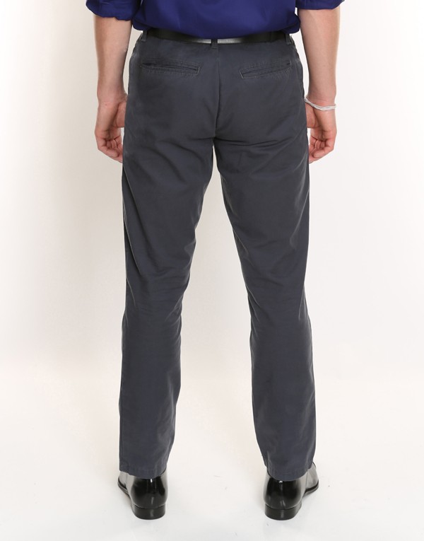 Straight leg chino. Back pockets with button closure. 14" leg opening. Zip fly. 100% cotton.